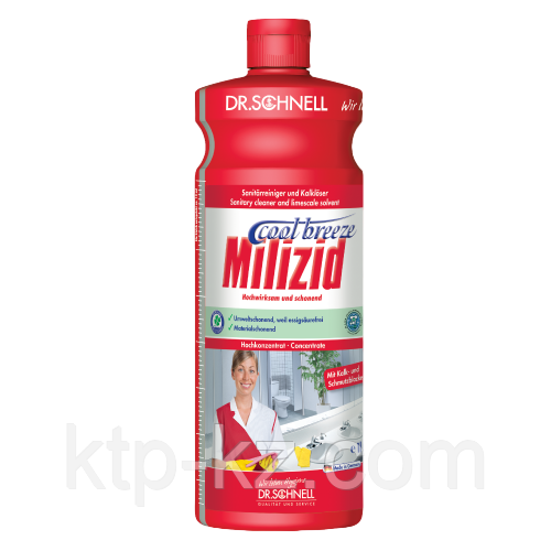 MILIZID COOL BREEZE (Dr.Schnell) – мягкое кислотное средство с приятным ароматом для ежедневной уборки санузлов. Эффективно удаляет известковый налет, мочевой камень, жировые и косметические загрязнения, не образуя агрессивных паров. Обеспечивает гигиеническую чистоту и свежесть. Биоразлагаемо.